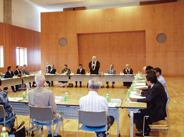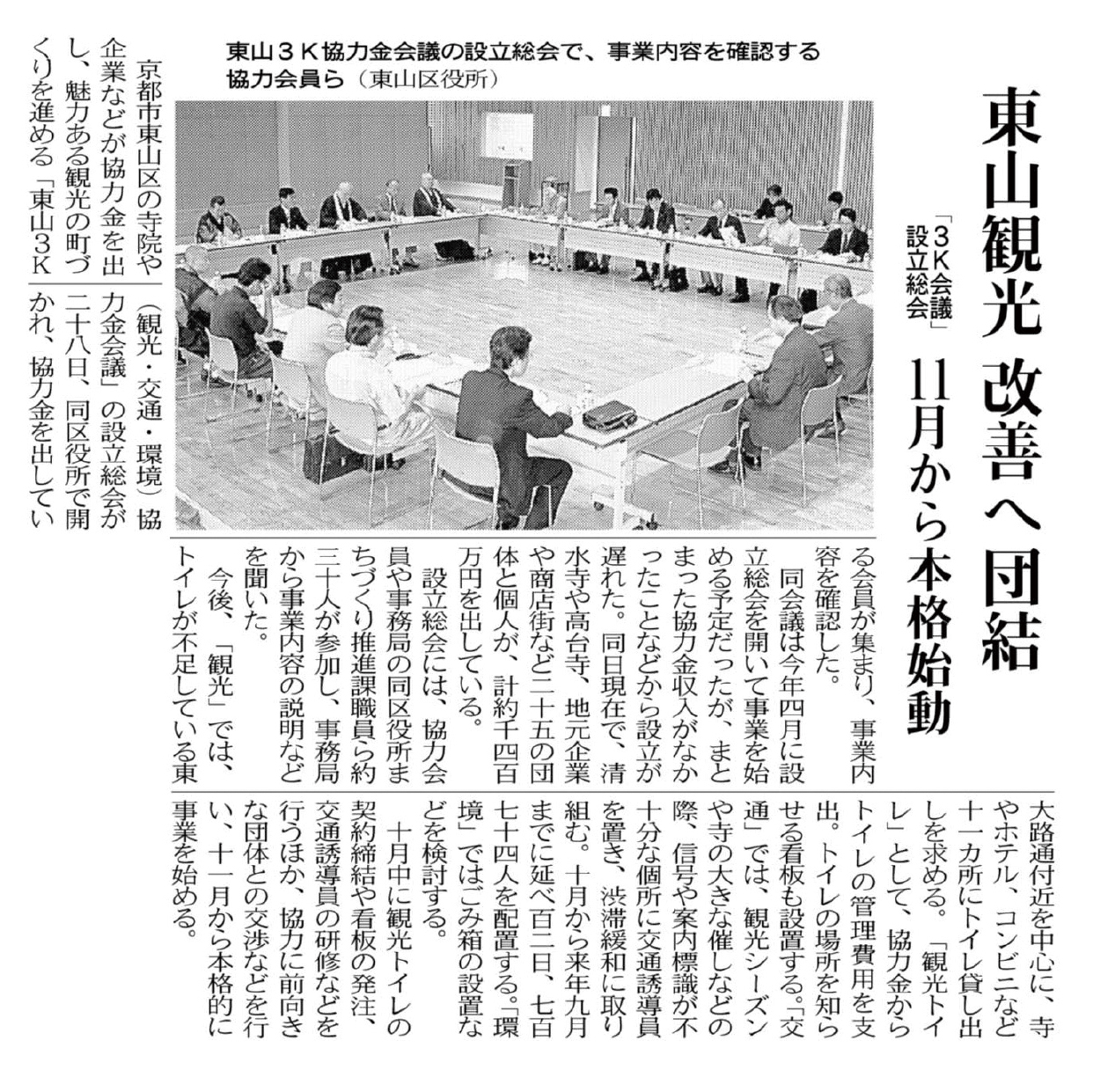 東山の3K課題(観光・交通・環境)の解決など、魅力あふれるまちづくりを進めていくため、区内の寺社、企業、団体等で構成する東山「観光・交通・環境」協力会議が動き出します。平成17年9月26日に評議員会及び理事会、同月28日に設立総会を開催し、議長に六波羅蜜寺 川崎純性 山主が選任され、年度の事業内容等についての検討を行い、秋の観光シーズンとなる11月から観光客向けのトイレの貸出し、歩行者の安全を確保するための交通誘導員の配置などを実施することになりました。
