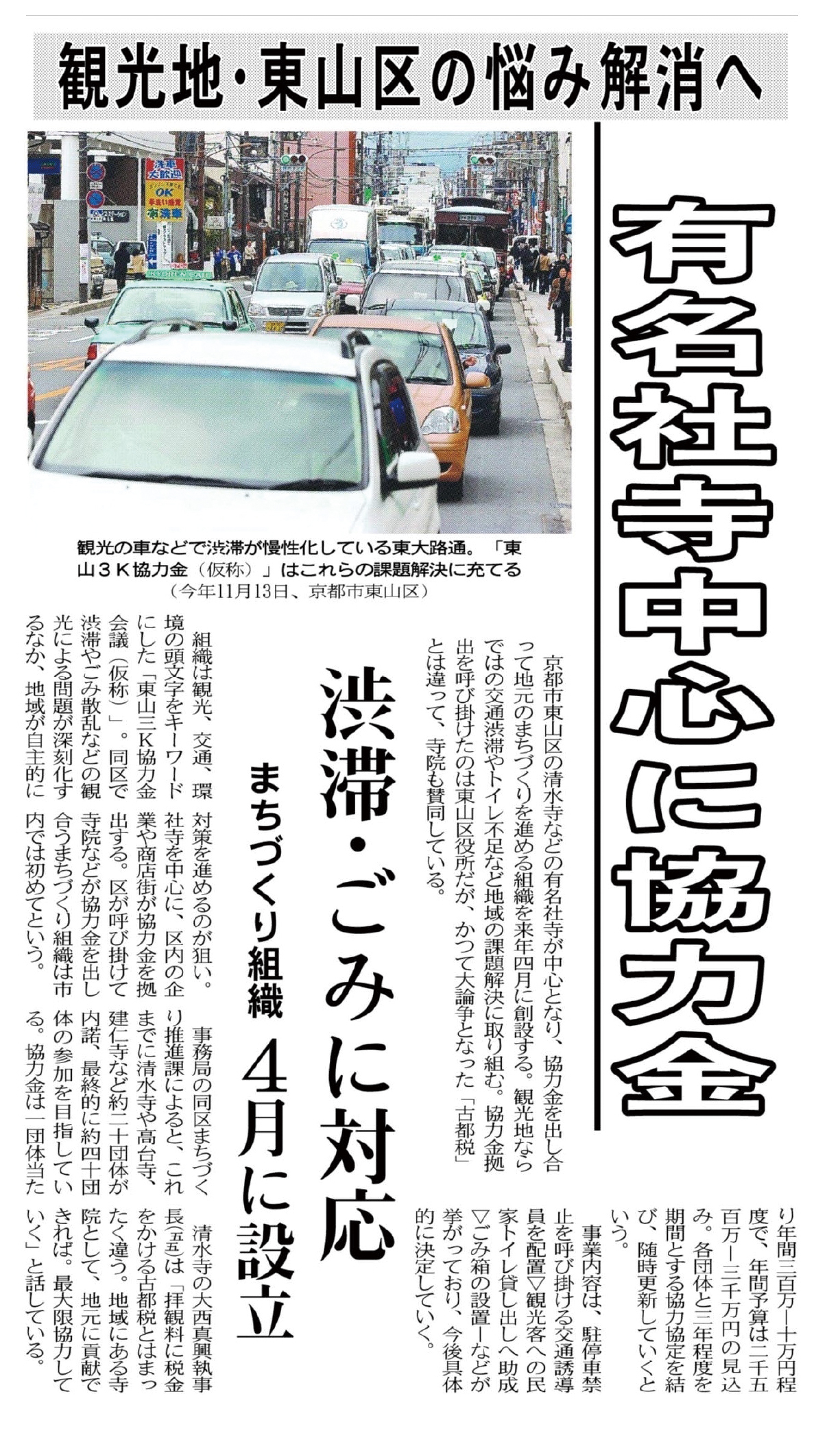 平成17年、これらの課題を解決し、東山を更に魅力のあるまちにしていくため、地域の寺社、企業、団体等により構成する東山「観光・交通・環境」協力会議(通称:東山3K)の創設に到りました。