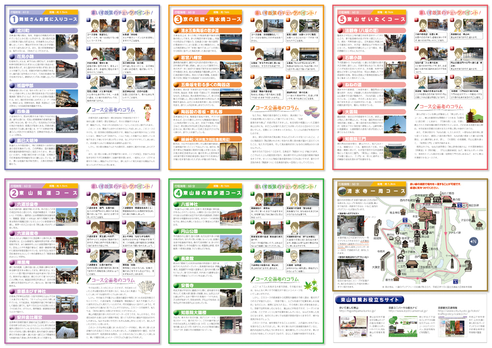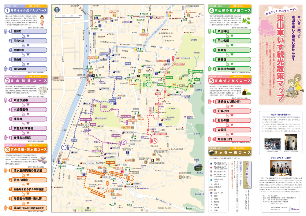 発行にあたっては,京都産業大学の学生が車いすを実際に使って三条通から五条通までの間を散策し,5つのコースを設定し,各コースの見所,道路等の特徴,散策にかかる時間等について記載しています。また,車いすで境内を一周できるようになった清水寺についての情報も記載しています。