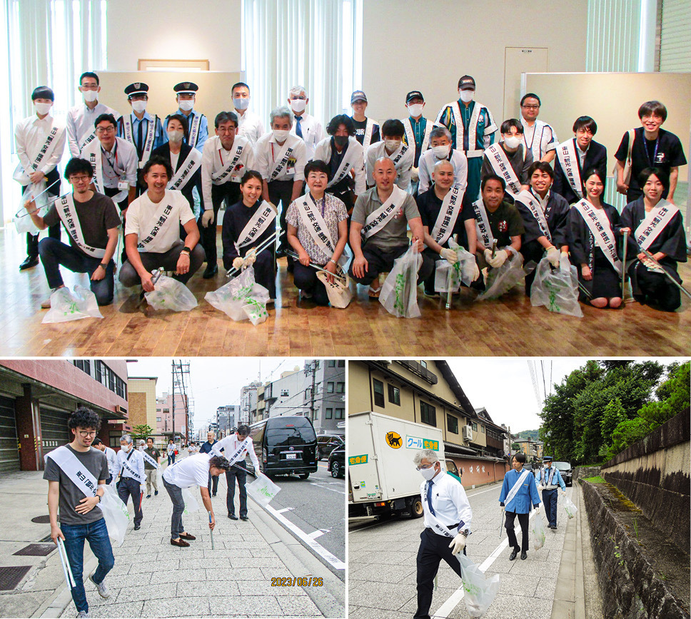 令和5年6月26日(月)、本会議は、「ひとに優しい、まちに優しい東山」の理念のもと、東山に暮らす方々、訪れる方々に快適にお過ごしいただくための活動の一環として、東大路、清水寺参道及び高台寺周辺のボランティア清掃を実施しました。